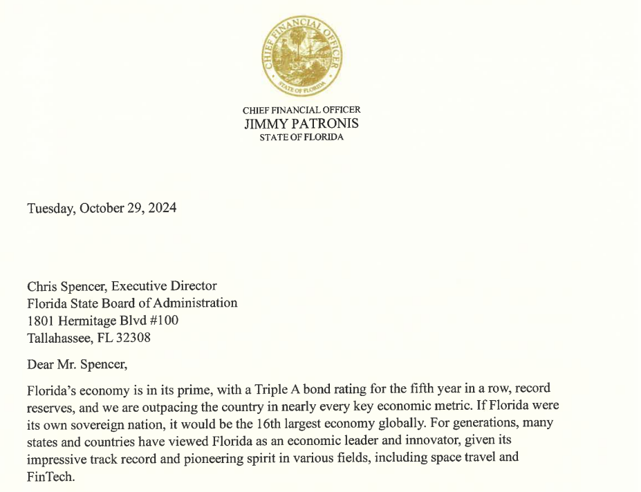In a letter to Chris Spencer, head of the Florida State Board of Administration (SBA), Patronis suggested exploring Bitcoin investments as a potential hedge against market volatility.